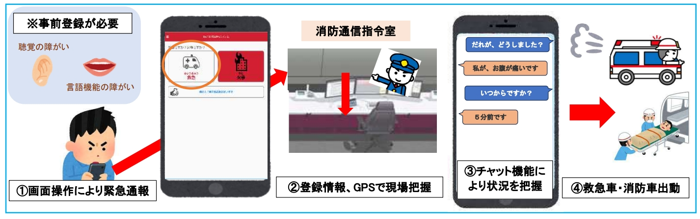 スマートフォンや携帯電話を利用し、文字による通報ができるものです。